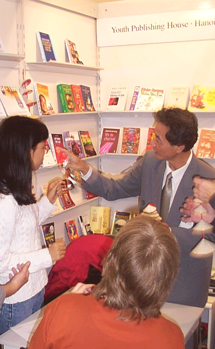 Frankfurter Buchmesse Seit Jahrzehnten unterstützen wir das vietnamesische Verlags- und Buchwesen dadurch, dass wir jedes Jahr einen kleinen Stand auf der Frankfurter Buchmesse bezahlen, in dem vietnamesische Verlage ihre Neuerscheinungen ausstellen können. Weiterhin können unsere Freunde durch die Teilnahme an der weltweit wichtigsten Buchmesse internationale Kontakte pflegen: mit Kunden, aber auch mit Verlagen und Agenturen aus der ganzen Welt. Es können Verhandlungen geführt und Verträge abgeschlossen werden über Ausgaben vietnamesischer Bücher im Ausland oder die Übersetzung ausländischer Bücher in Vietnam. |