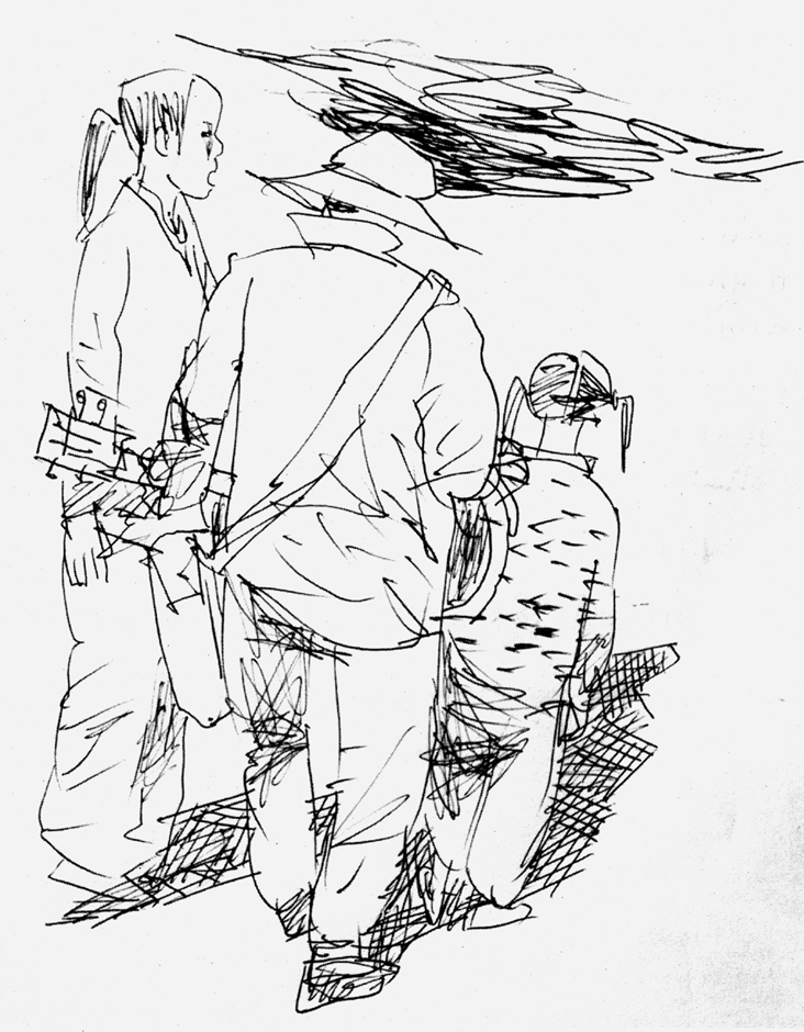 Auf den ersten Blick bemerkte niemand, dass er blind war, denn er wirkte stets ruhig und gelassen. Jeden Tag zog er mit seiner kleinen Familie über den Cu-Markt, überquerte die Nhum-Brücke, um dann den ganzen Tag lang in der näheren Umgebung herumzustreifen. Ihr Arbeitstag begann früh am Morgen und dauerte bis spät in den Abend. Nhu ging voraus, in einer Hand einen Lautsprecher, in der anderen ein Seil, das an der Gitarre ihres Vaters befestigt war, um seine Schritte in die richtige Richtung zu lenken. An ihrer Seite hielt sich die kleine Y, die versuchte, den Passanten Lotterielose zu verkaufen und so ein wenig Geld einzubringen. In zerknitterten Kleidern und mit zerstrubbelten Haaren bahnten sie sich ihren Weg durch die Menge. Doi folgte seinen Töchtern, sang populäre Gassenhauer, die er auf der Gitarre begleitete. Entrückt lächelnd, Blumen im Haar, lief seine Frau hinterher und stimmte ein in seinen Gesang. So schob sich der kleine Trupp langsam auf holprigem Pfad durchs Gedränge und erwarb den kümmerlichen Lebensunterhalt.