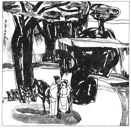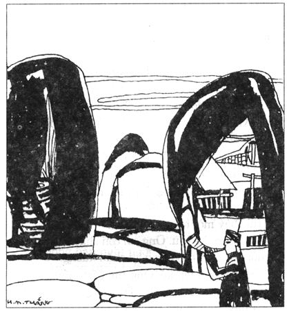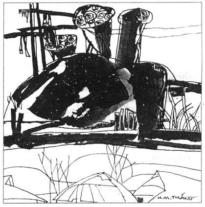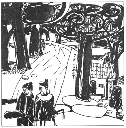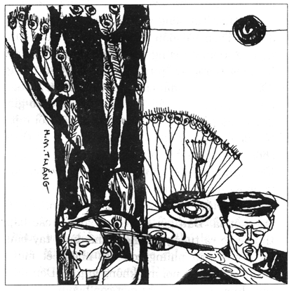 In jenen Tagen lebten Fremde in Hua Tat; niemand wußte, aus welchem muong sie stammten. Sie bauten ein Haus am Dorfrand, in der Nähe des verwunschenen Waldes. Nur zwei betagte Leute, ein Mann und seine Frau, lebten in diesem Haus. Gingen sie aus, so gingen sie stets zu zweit. Die Frau war immer düster und stumm, oft hörte man von ihr den ganzen Tag keinen einzigen Ton. Der hochgewachsene, magere Mann hatte ein starres Gesicht, seine Nase glich einem Vogelschnabel. Die verschattet und tief liegenden Augen des Alten schienen dunkles kaltes Phosphorlicht abzustrahlen.