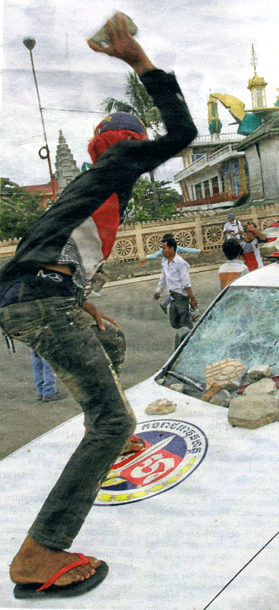 Abb.: Sam Rainsy-Anhänger attackiert Polizeiauto - vor den Wahlen (Bild VNS)