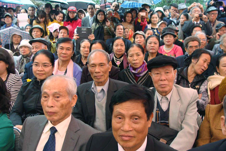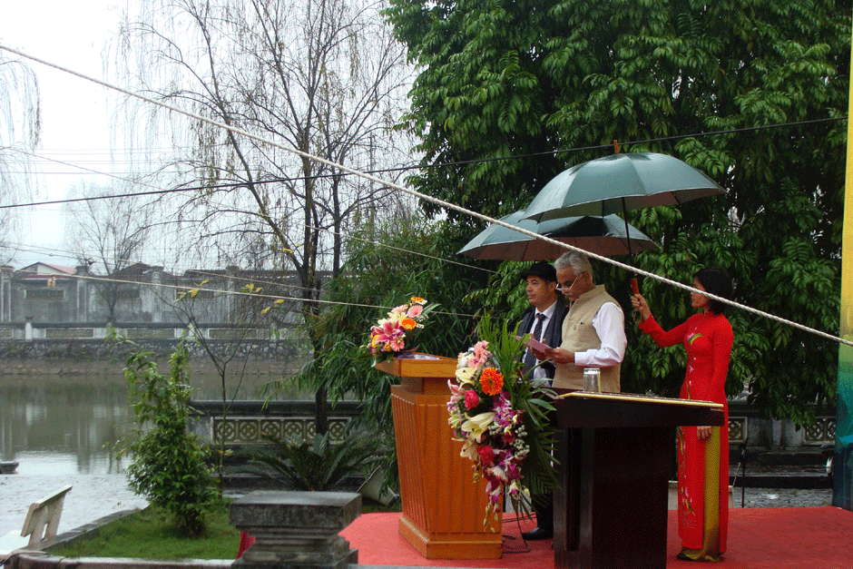 Ein Ausflug in das nicht weit von Hanoi gelegene Dorf Phu Thi galt einer Zeremonie zu Ehren des dort geborenen Dichters Cao Ba Quat (1808-1855), der ein Bauernführer gegen den Feudalismus gewesen war und entsprechende Gedichte geschrieben hat. Es wurde ein Faltblatt verteilt mit den nötigsten Informationen und drei Gedichttexten. Es musste für die Dorfbewohner, die diese Zeremonie jährlich vollziehen, ein seltsames Erlebnis gewesen sein, plötzlich von gut 250 Menschen und geschätzten 10 Fernsehteams bei diesem Tun beobachtet zu werden. Man hatte Schirme gegen den Regen aufgespannt, es gab auch hier Redebeiträge und Gedichtrezitationen. Wer über die Mauer der Pagode schauen konnte, sah ein anscheinend idyllisches Dorf, dorthin zu spazieren war jedoch nicht möglich.