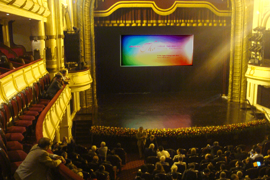 Das war natürlich besonders unangebracht bei den Gedichtlesungen. Manche sehr persönlichen und intimen lyrischen Texte verloren dadurch viel von ihrem ästhetischen Reiz. Hinzu kam, dass sie meist in der Originalsprache von den Autoren vorgetragen und dann ad hoc von professionellen Dolmetschern ins Vietnamesische/Englische übersetzt wurden, die wohl sonst bei geschäftlichen Verhandlungen eingesetzt werden. Dabei passierten schlimme Pannen: „Als der amerikanische Dichter sein Gedicht vorgetragen hatte, sagte der Übersetzer etwas allgemeines über das Thema, aber nach einigem Zögern musste er zugeben, dass er sich nicht mehr an den genauen Text erinnern könne, er könne es nicht übersetzen. Die beiden verließen hastig die Bühne, trotzdem gab es Beifall.“13 Der Übersetzer hatte weder einen Ausdruck des Originaltextes noch eine geschriebene Übersetzung zu seiner Verfügung. Ad hoc kann niemand ein Gedicht übersetzen, zumal, wenn er es gerade zum ersten Mal hört.