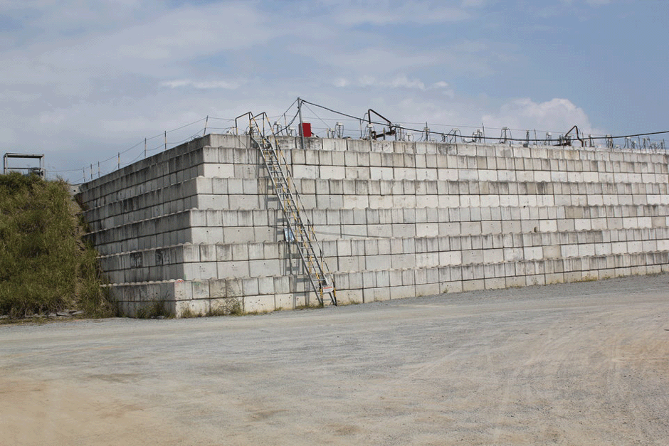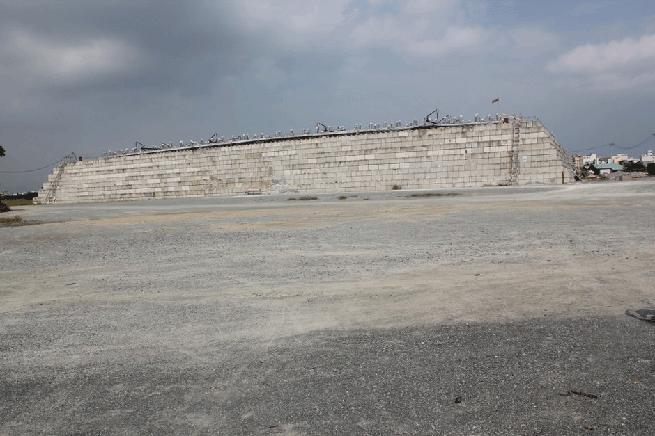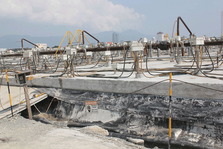 Seit 2012 sind nun Männer in weißen Hazmat7-Anzügen neben dem aktuellen Flughafen damit beschäftigt, das Areal der früheren Basis zu säubern, während über ihnen die Flugzeuge starten und landen. Sie tragen die Erde ab und bringen sie in eine Art riesigen Ofen. Wenn dieser mit etwa 45.000 m³ Schmutz beladen ist8, wird er mit Betonblöcken verschlossen. Von oben werden dann Heizelemente in die Ladung eingeführt und das Ganze erhitzt.