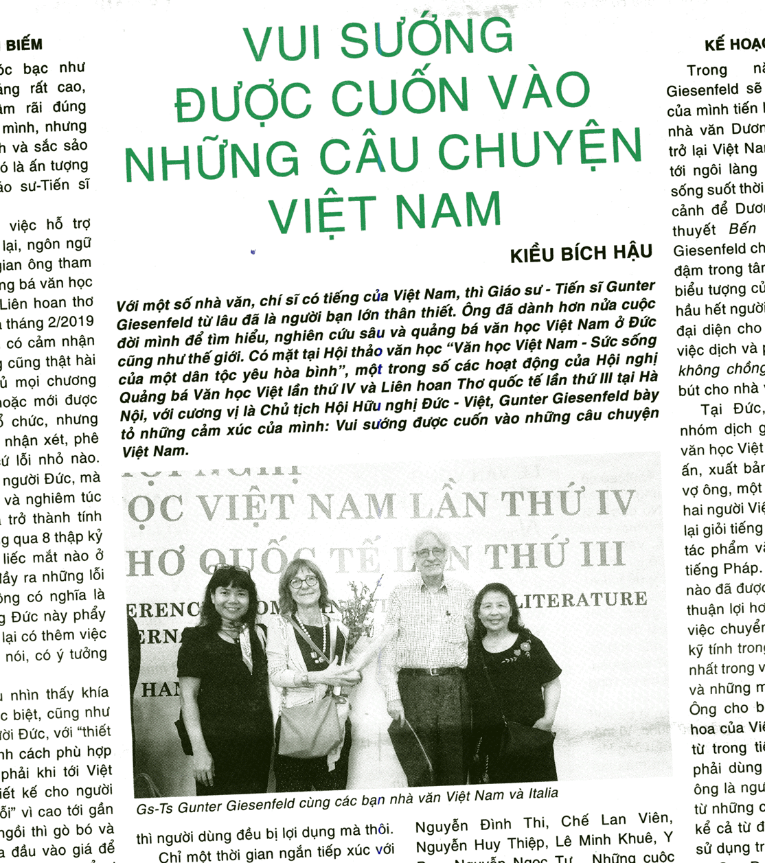 Vor allem letzteres habe ich allerdings erst später erfahren, und zwar auf eigenartige Weise: Während der Konferenz lag regelmäßig Van Nghê?, die Zeitschrift des Schriftstellerverbandes, aus, ich nahm sie wie jeder mit, konnte aber nicht viel damit anfangen – vietnamesisch! Eines Tages wies mich aber Lady Borton, die in Hanoi lebende Amerikanerin darauf hin, ich solle doch mal die Ausgabe 84 lesen. Und ich entdeckte auf der Seite 16 ein Bild, auf dem ich mit Lê Minh Khuê zu sehen bin. Und ich stellte fest, dass im Text des ganzseitigen5 Artikels mehrfach mein Name auftauchte – ein Artikel über mich, geschrieben von Kiê`u Bi´ch Hâ?u! Später erfuhr ich, dass noch ein ähnlicher Artikel von ihr über mich in der Parteizeitung Nhân Dân stand.6