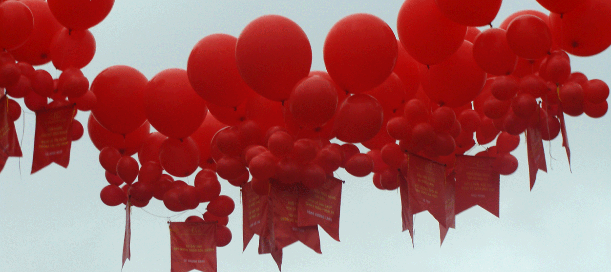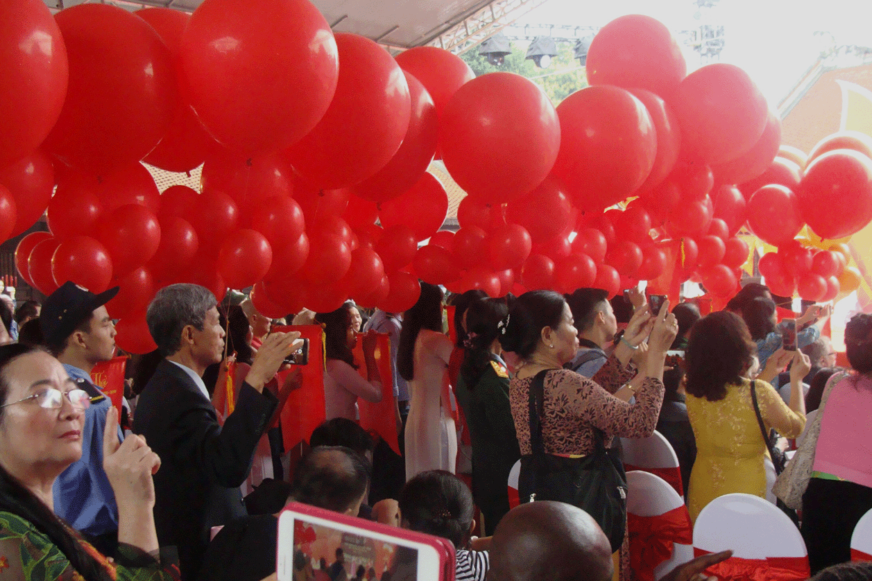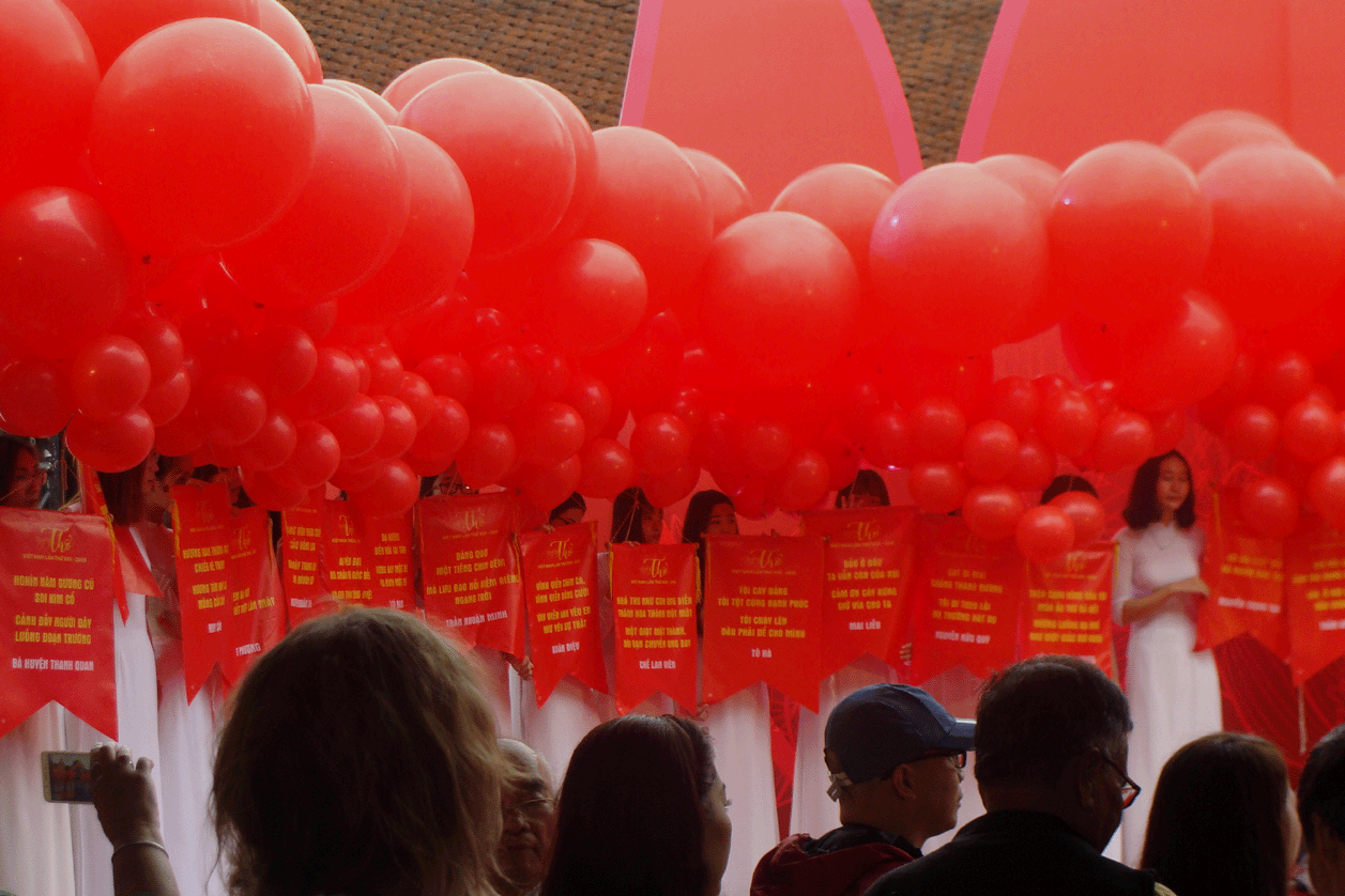 Gegen Ende der Konferenz wurde dann der Spagat zwischen den beiden gleichzeitigen, aber so verschiedenen Veranstaltungen auf geniale Weise überbrückt bei einer Aktion, die im Literaturtempel in Hanoi stattfand. Während sich auf der Bühne die üblichen Tanzvorführungen mit Gedichtrezitationen abwechselten, versammelten sich auf den Wegen zwischen den Sitzen der Zuschauer immer mehr junge, in weiße Ao Dais gekleidete junge Frauen, die je eine Luftballon in der Hand hielten. Ich erinnerte mich, dass sich dasselbe auf der letzten Konferenz auch schon abgespielt hatte: Gegen Ende bewegten sich die Ballons an der Hand ihrer Trägerinnen auf die Bühne und stellten sich auf. An jedem Ballon hing ein Zettel, auf dem ein Gedicht ge schrieben stand. Ich suchte und entdeckte auch eines von Ch? Lan Viên.