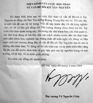 Zweiter Brief (Telegramm) an das Kolloquium über Bauxit im Tay Nguyen Ich bin davon informiert worden, daß heute das Kolloquium über Bauxit im Tay Nguyen stattfindet, das geleitet wird vom Genossen Vize-Premierminister Hoang Trung Hai. Nach meiner Meinung handelt es sich um ein sehr wichtiges Thema, das nicht ohne Folgen bleiben wird. Und ein Problem mit dem ich sehr vertraut bin. Ich habe dazu einen Brief an den Genossen Ministerpräsidenten geschrieben und ich habe darauf noch keine Antwort erhalten. Ich hoffe, daß auf diesem Kolloquium Wissenschaftler, Beamte und Soziologen ihrer Verantwortung gegenüber dem Volk gerecht werden und wissenschaftlich, ernsthaft und offen darüber sprechen, und daß sie der Partei und der Regierung einen Entschließungsantrag unterbreiten werden, eine gerechte Handlungsanweisung angesichts des „Bauxit-Problems“ im Tay Nguyen. Meine Meinung ist, daß man auf den Abbau verzichten sollte. Im allgemeinen Interesse und für die langfristige Entwicklung unseres Landes würde der Abbau äußerst gewichtige Folgen haben im Hinblick auf die Ökologie, die Gesellschaft und die Sicherheit. Die beste Gesundheit für alle. Hanoi, am 09. April 2009 General V. N. G. |