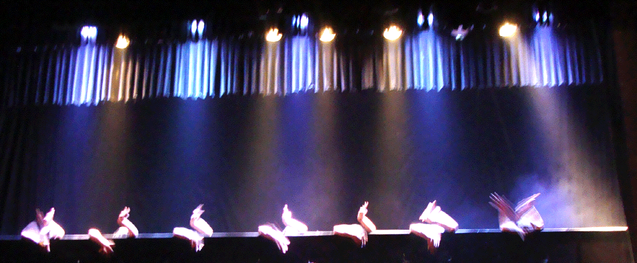 Als erstes waren einige Nummern mit lebensgroßen Puppen zu sehen, die von je einem schwarz vermummten Schauspieler geführt wurden. Dieser saß hinter der Figur, seine Beine waren die der Figur, seine Arme und sein Kopf bewegten die jeweiligen Körperteile der Figur durch Hebelchen aus Holz. Und damit sich das Ganze frei auf der Bühne bewegen konnte, waren die Schemel, auf denen sie saßen, mit Rädern versehen, so dass sie hin- und herfahren konnten, ja sogar im Kreis oder in Formation getanzt werden konnte.