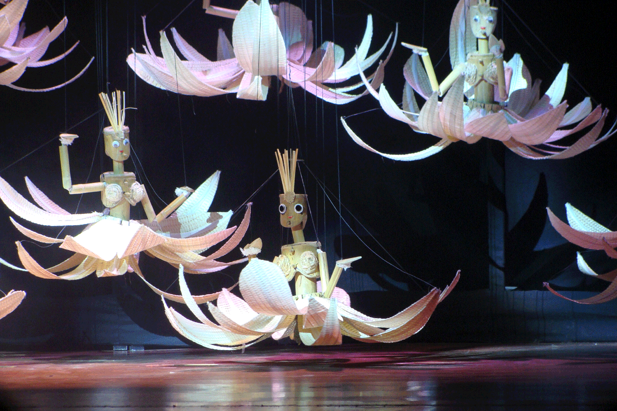 Der größte Teil des Programms war aber den „richtigen“ Marionetten gewidmet. Das heißt, solchen Figuren oder Puppen, die an Schnüren von oben bewegt werden. Sie unterscheiden sich aber in Vietnam sehr stark von den Marionetten, die wir aus unserer europäischen Kultur kennen: Es sind nur in Ansätzen Wesen mit einem menschlichen Körper, sondern Zwischenformen, die Mensch, Tier und Pflanze in einem sein können.