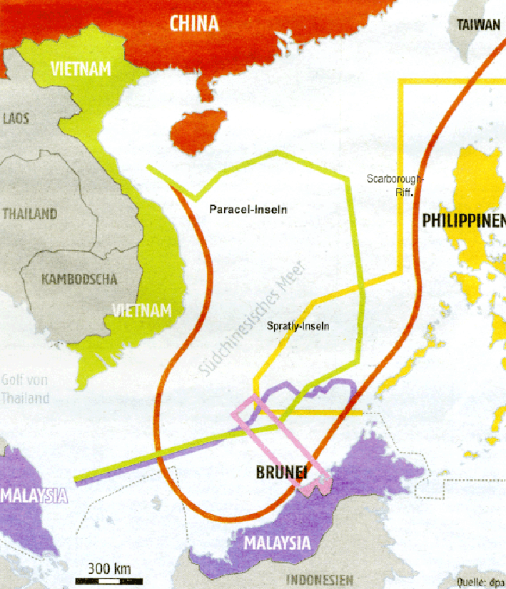 Was die Spratly-Inseln angeht, so ist die Lage viel komplizierter und angespannter. Nicht weniger als sechs Länder melden Ansprüche an und haben sie zum Teil bereits durch Taten bekräftigt. Die VR China, Taiwan und Vietnam beanspruchen auch hier die Totalitär der Inseln, die Philippinen, Malaysia und Brunei nur jeweils einen Teil.