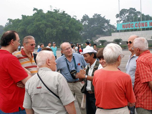 Bericht über unsere Studienreise im Oktober 2006 Was ist aus einem Land und einem Volk geworden, das nach über 1000-jähriger chinesischer Fremdherrschaft die Kraft hatte, seine Unabhängigkeit gegen französische Kolonialherren, eine japanische Besetzung, eine barbarische militärische Intervention der USA zu erkämpfen und zu behaupten? Wie hat sich die im Juli 1976 offiziell gegründete Sozialistische Republik Vietnam in einer Welt der Globalisierung und des weltweit fast allein herrschenden Kapitalismus entwickelt? Dies waren die Hauptfragen, die sich unsere 15 Personen umfassende Reisegruppe - allesamt frischgebackene Mitglieder der "Freundschaftsgesellschaft Vietnam" und überwiegend Naturfreunde - stellte, als wir in dieses Land fuhren. Im Rückblick auf unsere sehr aufregende und interessante Reise müssen wir wohl resümieren: Trotz unserer Anwesenheit bei einer Feier in Hanoi aus Anlaß des 16. Jahrestages der deutschen Wiedervereinigung, trotz der Besuche in einer Hörgeschädigten-Schule in Hanoi und eines Reha-Zentrums für dioxingeschädigte Kinder in der Provinz Da Nang und trotz unseres Deutsch sprechenden vietnamesischen Reiseführers haben wir Vietnam vor allem aus den Augen von Touristen kennen - und auch schätzen gelernt. Insofern ist unser Bericht weniger eine Gesellschaftsbeschreibung oder gar -analyse als eben ein Reisebericht. Unsere dortige Agentur hatte sich auch viel Mühe gegeben, uns die touristischen Highlights und dazu recht luxuriöse Reisebedingungen zu bieten. Im Folgenden wollen wir einige Reiseeindrücke vermitteln. Vom Bus aus, der uns vom Flughafen Hanoi-Noi Bai zu unserem Hotel mitten in der Altstadt brachte, bestaunten wir das erste vietnamesische "Wunder": den Straßenverkehr. Ein unvorstellbarer Strom von Kleinkrafträdern japanischer Fabrikate (100 bis 125 ccm, 4-Takt Motoren, alle ziemlich neu, also relativ leise und abgasarm) ergießt sich ununterbrochen durch die Gassen und Straßen und überflutet sogar die Bürgersteige, Märkte und Läden. Ihre Lenker - Männer und Frauen in gleicher Zahl - fahren in cm-Abständen neben-, vor- und hintereinander, unentwegt hupend und fast ohne jedes System und dennoch: Alles ist immer im Fluß und jeder paßt auf und nimmt Rücksicht. Anfangs hielten wir es für unmöglich, als Fußgänger überhaupt lebend eine große Straße zu überqueren. Es hat geklappt! Es gibt wenig Pkws, keine Straßen- oder U-Bahn in dieser 3 Millionen-Stadt, nur ein langsam entstehendes Busnetz. Dafür wird auf diesen soliden "Mopeds" dann auch alles transportiert, was bei uns Taxis, Pkws oder gar Lkws übernehmen: Bis zu 5 Personen auf einem Motorrad, vier lebende Schweine, riesige Körbe mit Dutzenden Hühnern, mehrere Fahrräder, sogar Stahlträger werden auf diesen Allzweck-Fahrzeugen transportiert. Fahrräder, das häufigste Schülertransportmittel und Rikschas (Cyclos) - für Spezialtransporte oder Touristen-Sightseeing-Touren sind von den Kleinmotorrädern längst fast ganz verdrängt. Unter Willy's Führung (so wollte unser vietnamesischer Reiseleiter genannt werden) und teils auch auf eigene Faust, haben wir dann Hanoi langsam erobert, allem voran die Altstadt mit den bunten und reichhaltigen Märkten, die Hunderte von Läden entlang den Straßen und Gassen, und den Hoan Kiem See, das Herz der Stadt. Abends, beim Besuch des Wassermarionettentheaters und am nächsten Tag im Ho Chi Minh-Mausoleum, im Ho Chi Minh-Museum und Pfahlbauwohnhaus, im Präsidentenpalast und Literaturtempel waren wir dann immer unter Hunderten wenn nicht gar Tausenden von Touristen. Für uns Langnasen aus dem fernen Europa war dabei schwer zu erkennen, wer von den Asiaten aus dem Land stammte und wer aus Laos, Thailand, China, Taiwan oder Singapur gekommen war. Wir hatten nicht erwartet, daß wir Europäer in Vietnam eine Minderheit unter den Touristen sein würden. Natürlich haben wir uns angesichts des Massenverkehrs immer wieder die Frage gestellt: Was wird sein, wenn all diese Menschen später einmal mit Autos unterwegs sein werden? Für die jetzige Infrastruktur einfach unvorstellbar. Anläßlich der Besuche in mehreren Tempeln und Pagoden wurde uns eine weitere Besonderheit Vietnams klar: Dank seiner eigenen ursprünglichen Kultur, durch die Einflüsse Chinas, der indischen Kultur und der Bergvölker, aber auch der Kolonialherren ist Vietnam zu einem Schmelztiegel der Kulturen und Religionen geworden. Buddhismus, Konfuzianismus, Taoismus (Laotse), Christentum, Hinduismus, Islam und sogar Animismus und ein ausgeprägter Ahnenkult existieren heute großenteils friedlich nebeneinander. Da verwundert es kaum, daß selbst der religionskritische Kommunist und Held des vietnamesischen Freiheitskampfes, Ho Chi Minh eine fast religiöse Verehrung genießt. Nach dem stressigen Großstadttrubel in der Hauptstadt waren die anschließenden Tage in der Ha-Long-Bucht (Weltkulturerbe) ein Balsam für Auge, Ohr und Seele. In einer weiten Meeresbucht entlang der Küste Richtung China ragen dort etwa 2000 Kalksteininseln malerisch und fotogen aus den Wellen. Die Legende berichtet von einem weiblichen Drachen und ihren Kindern, die vom Jadekaiser ausgesandt wurden um eine feindliche Invasion zu verhindern. Dabei spuckten diese Drachen eine große Menge Perlen aus, die als Felsen den Feinden den Weg versperrten. Die wunderbaren Mahlzeiten mit reichlich Meeresfrüchten aller Art im vornehmen Salon unseres Hotelschiffes, das entspannende Sonnenanbeten an Deck, während das Holzboot friedlich und sanft durch die Inseln tuckerte, der Besuch einer eindrucksvollen Höhle und die Badepausen im warmen Meerwasser brachten besonders den Berufstätigen unserer Gruppe ein echtes Gefühl von Urlaubserholung. Aber nun ging es mit dem Bus an Haiphong vorbei auf der Nationalstraße N1 in Richtung Süden. In Ninh Binh wurden wir beim Besuch der Königstempel aus der Dinh- und Le Dynastie und bei der landschaftlich wunderschönen Fahrt in kleinen Ruderbooten durch die Tam Coc 